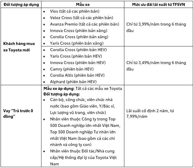 Ngoài ra, trong tháng 1/2026, Công ty tài chính Toyota Việt Nam (TFSVN) cũng thực hiện chương trình ưu đãi cho các khách hàng vay mua xe với mức lãi suất ưu đãi hấp dẫn: