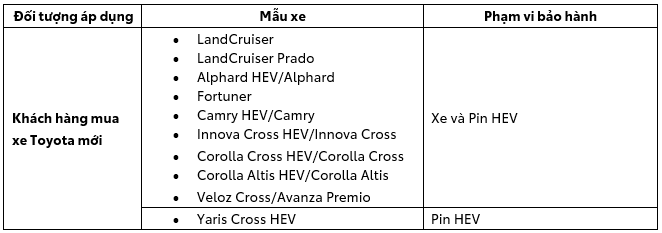 1.3. Đối tượng áp dụng: Tất cả khách hàng mua xe (thuộc mục 1.2), hoàn tất thủ tục thanh toán 100% và Đại lý Toyota Hưng Yên đã xuất hóa đơn GTGT cho khách hàng trong thời gian diễn ra chương trình